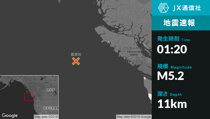 | 震源地 | カナダのPort Hardyから南西235kmの地点 |