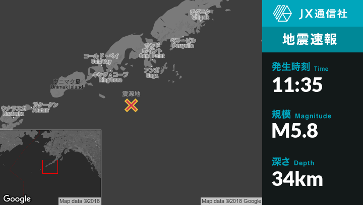 12月31日 11:35頃、アラスカのCold Bayから南東132kmの地点でM5.8の地震がありました。