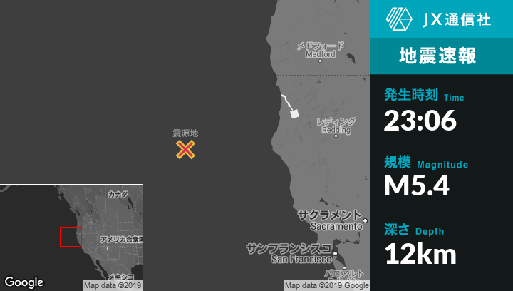 4月12日 23:06頃、カリフォルニアのFerndaleから西236kmの地点でM5.4の地震がありました。