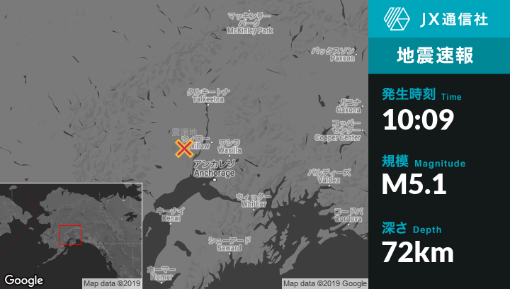 | 震源地 | アラスカのWillowから西42kmの地点 |