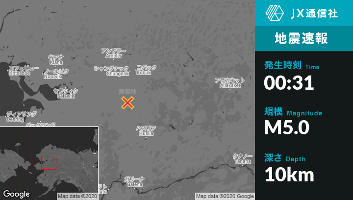 | 震源地 | アラスカのKobukから南南西61kmの地点 |