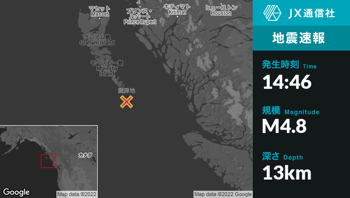 | 震源地 | カナダのPrince Rupertから南281kmの地点 |