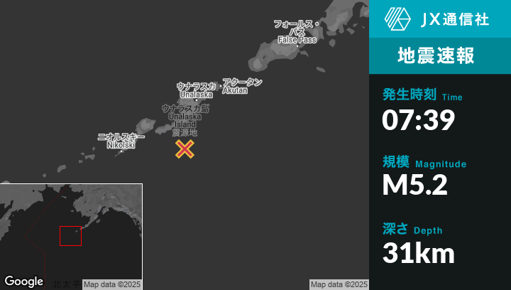 | 震源地 | アラスカのUnalaskaから南南西94kmの地点 |
