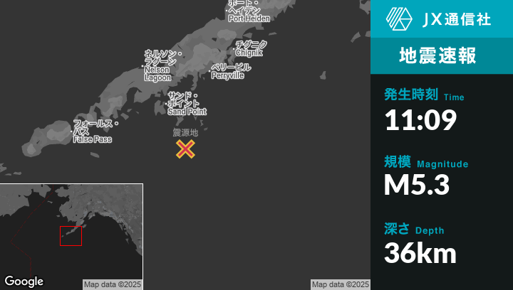 | 震源地 | アラスカのSand Pointから南南東90kmの地点 |