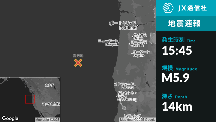 9月26日 15:45頃、オレゴンのBandonから西北西222kmの地点でM5.9の地震がありました。