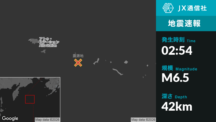 3月05日 02:54頃、アラスカのAttu Stationから東南東219kmの地点でM6.5の地震がありました。