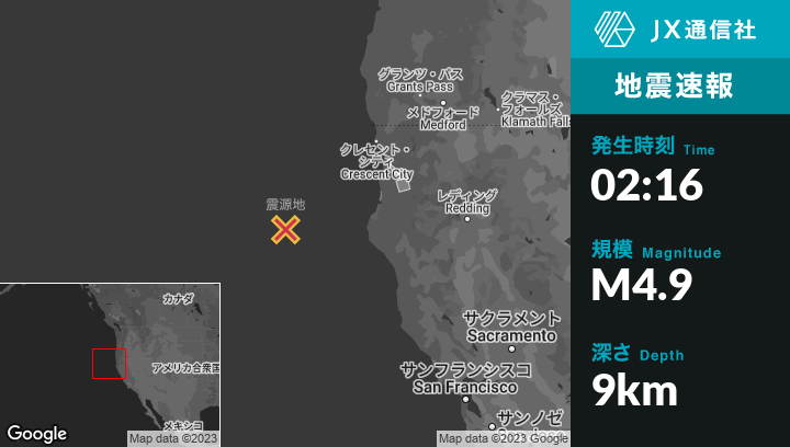 10月01日 02:16頃、カリフォルニアのFerndaleから西150kmの地点でM4.9の地震がありました。