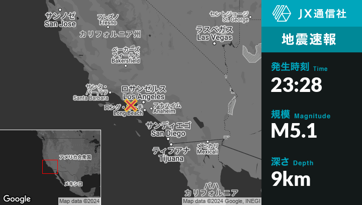 9月12日 23:28頃、カリフォルニアのMalibuから北西4kmの地点でM5.1の地震がありました。