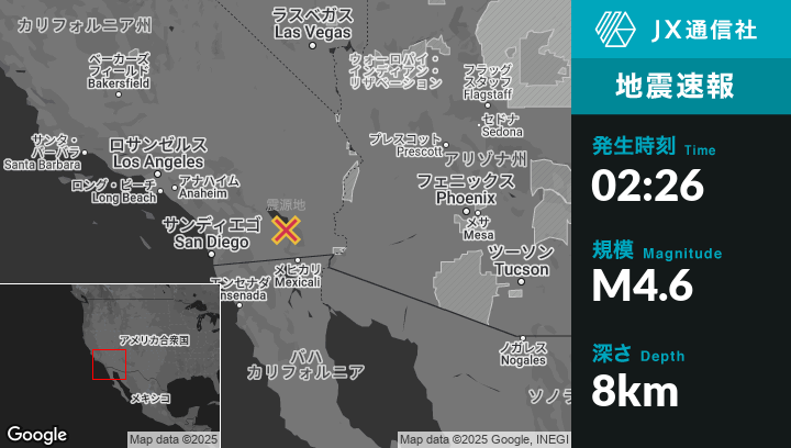 3月15日 02:26頃、カリフォルニアのBombay Beachから南南東14kmの地点でM4.6の地震がありました。