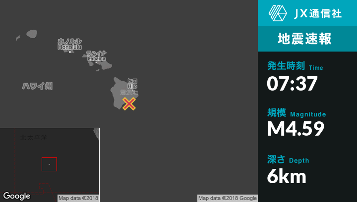 5月05日 07:37頃、ハワイのVolcanoから南17kmの地点でM4.59の地震がありました。