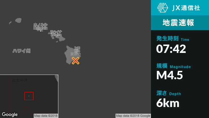 5月05日 07:42頃、ハワイのVolcanoから南13kmの地点でM4.5の地震がありました。