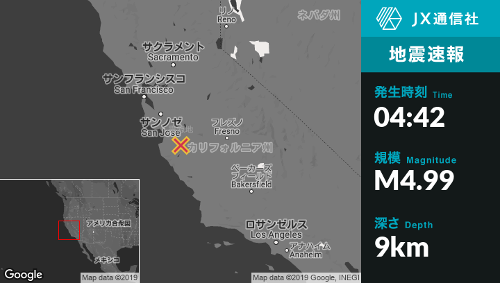 10月16日 04:42頃、カリフォルニアのRidgemarkから南南東19kmの地点でM4.99の地震がありました。