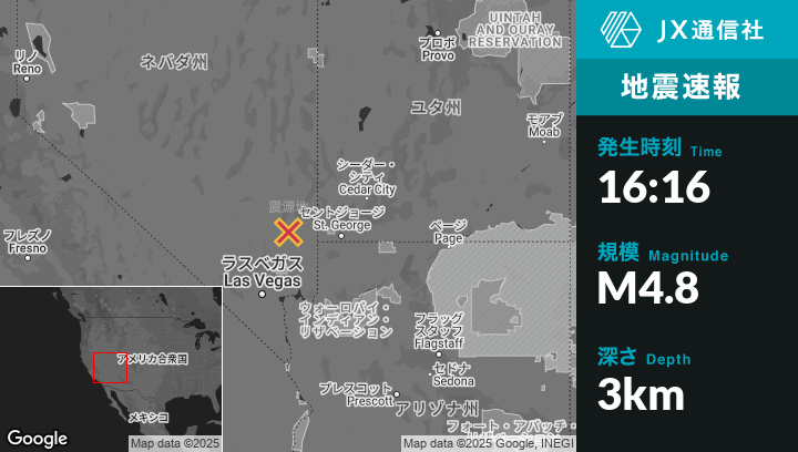6月06日 16:16頃、ネバダ州のCalienteから南南西41kmの地点でM4.8の地震がありました。