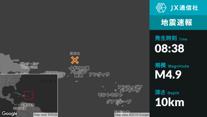 2月19日 08:38頃、イギリス領ヴァージン諸島のRoad Townから北北西113kmの地点でM4.9の地震がありました。