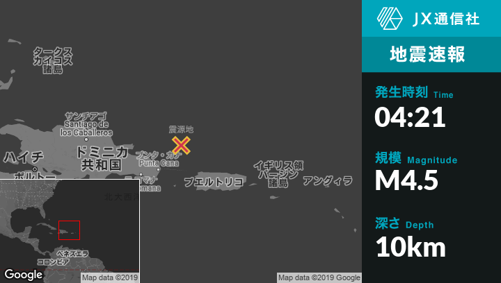 2月24日 04:21頃、ドミニカ共和国のPunta Canaから北東119kmの地点でM4.5の地震がありました。