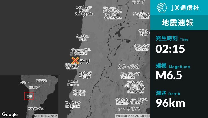 6月07日 02:15頃、チリのDiego de Almagroから西南西102kmの地点でM6.5の地震がありました。