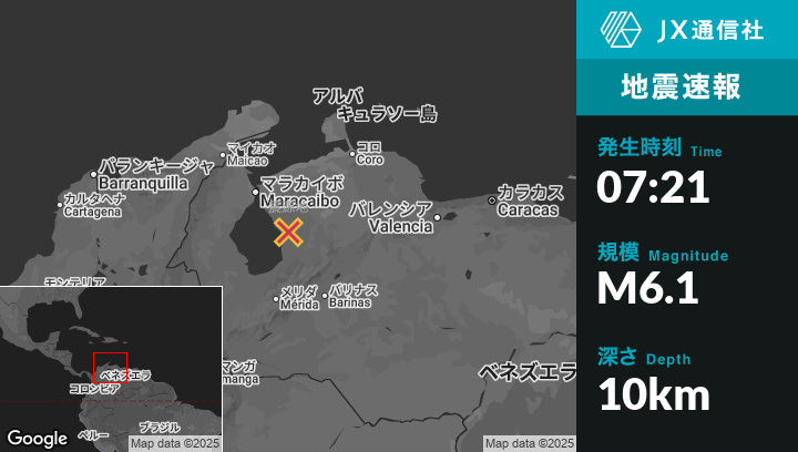 9月25日 07:21頃、ベネズエラのMene Grandeから北15kmの地点でM6.1の地震がありました。