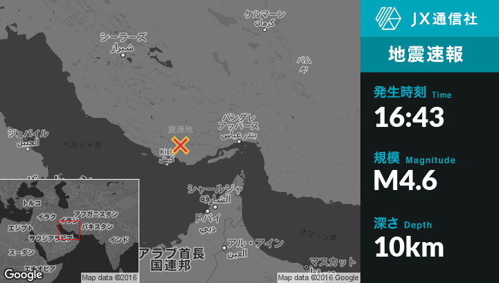8月21日 16:43頃、イランのLarから南56kmの地点で地震がありました。