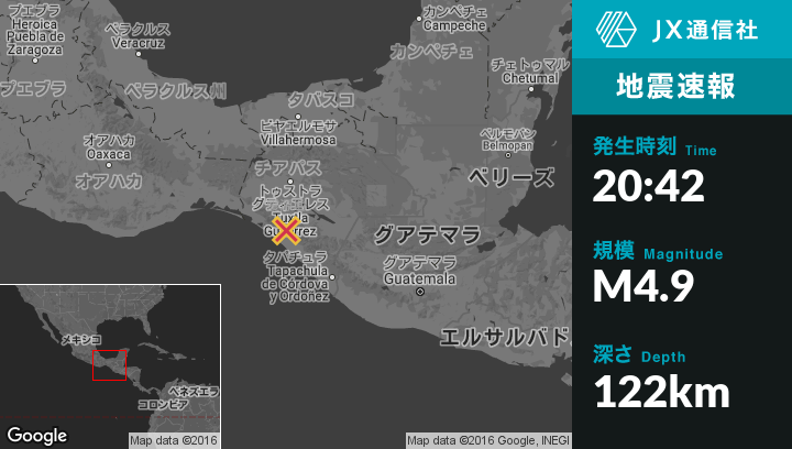 震源地メキシコのSan Pedro Buenavistaから南南西19kmの地点