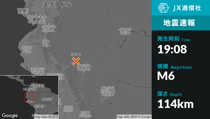 9月10日 19:08頃、ペルーのMoyobambaから北51kmの地点でM6の地震がありました。