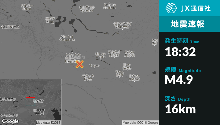 9月14日 18:32頃、モンゴル国のDzuylから南南西25kmの地点でM4.9の地震がありました。