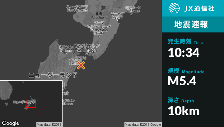 11月15日 10:34頃、ニュージーランドのBlenheimから南東44kmの地点でM5.4の地震がありました。