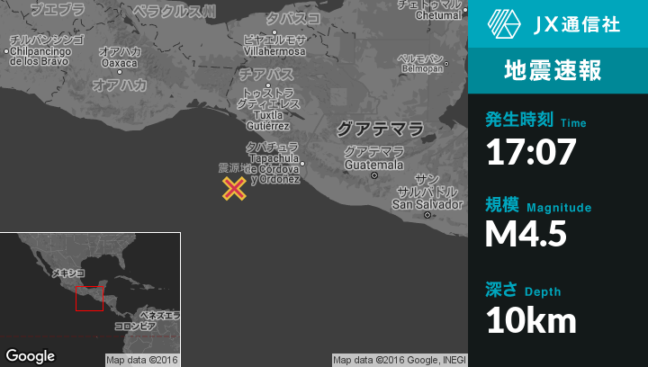 11月26日 17:07頃、メキシコのMapastepecから南西157kmの地点でM4.5の地震がありました。