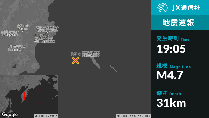 | 震源地 | ロシアのNikol'skoyeから西73kmの地点 |