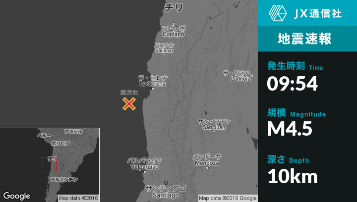 11月27日 09:54頃、チリのCoquimboから西南西103kmの地点でM4.5の地震がありました。