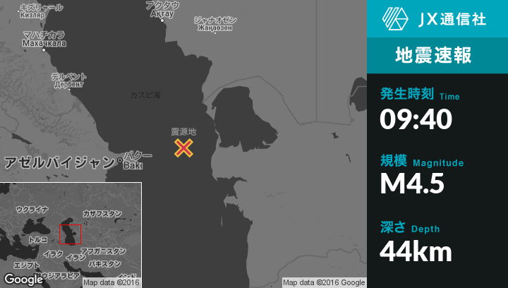 11月30日 09:40頃、トルクメニスタンのTurkmenbasyから北西127kmの地点でM4.5の地震がありました。