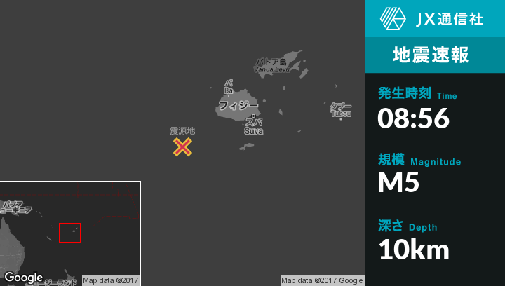 1月04日 08:56頃、フィジーのNadiから南西178kmの地点でM5の地震がありました。