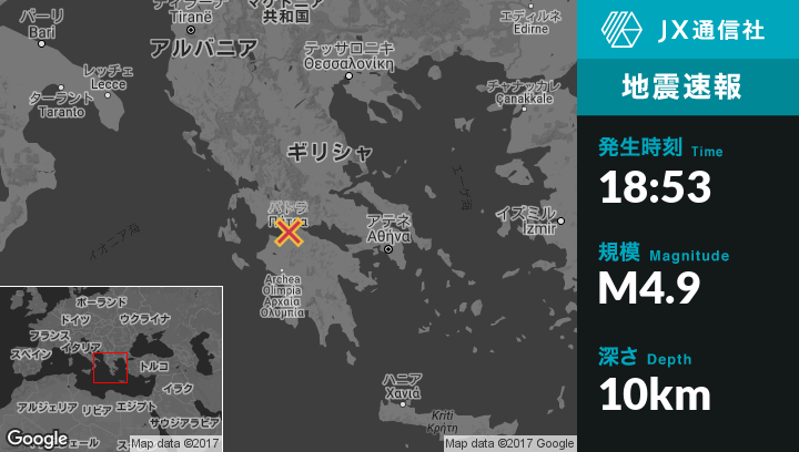 1月09日 18:53頃、ギリシャのRionから北北西6kmの地点でM4.9の地震がありました。
