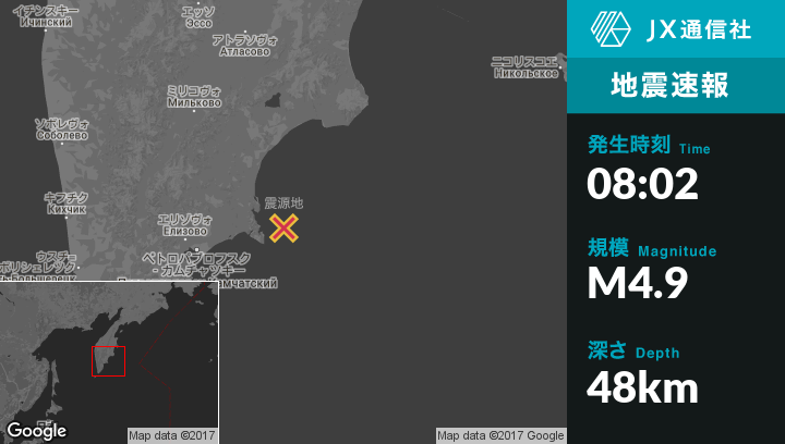 | 震源地 | ロシアのPetropavlovsk-Kamchatskiyから東北東124kmの地点 |