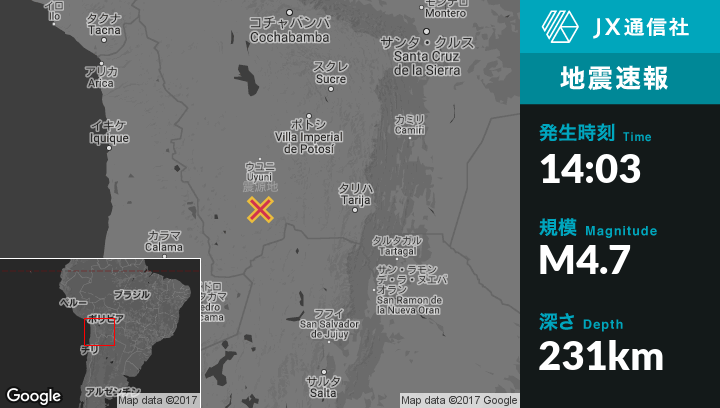 7月08日 14:03頃、ボリビアのAtochaから南西78kmの地点でM4.7の地震がありました。