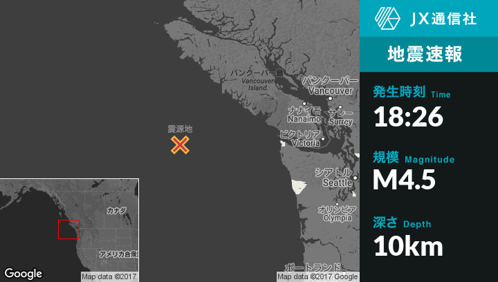 10月11日 18:26頃、カナダのTofinoから西南西169kmの地点でM4.5の地震がありました。