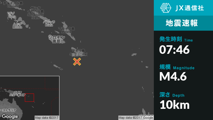 10月13日 07:46頃、ソロモン諸島のKirakiraから南南西79kmの地点でM4.6の地震がありました。