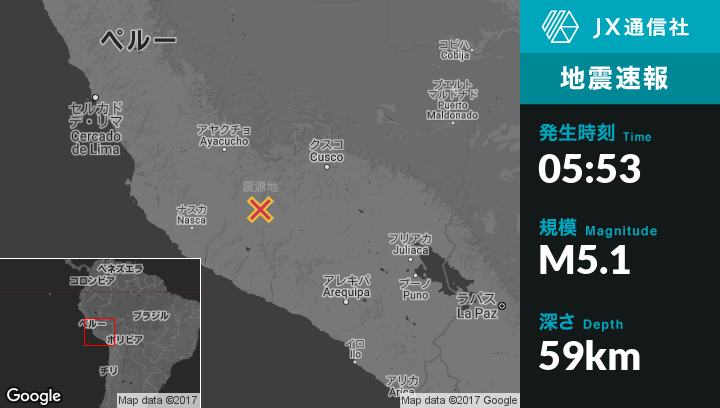 | 震源地 | ペルーのAndahuaylasから南74kmの地点 |