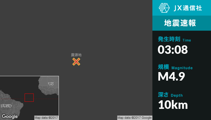 10月17日 03:08頃、ブラジルのFernando de Noronha (Distrito Estadual)から北東741kmの地点でM4.9の地震がありました。