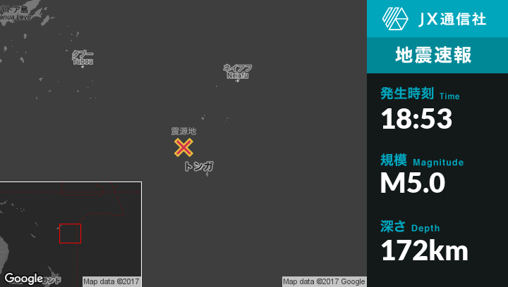 10月17日 18:53頃、トンガのNuku`alofaから北西86kmの地点でM5.0の地震がありました。