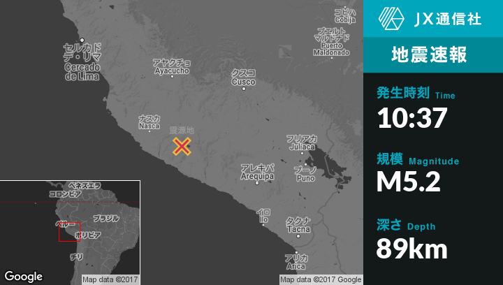 10月22日 10:37頃、ペルーのCoracoraから南西20kmの地点でM5.2の地震がありました。