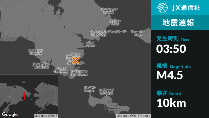 10月24日 03:50頃、ロシアのProvideniyaから北北東61kmの地点でM4.5の地震がありました。