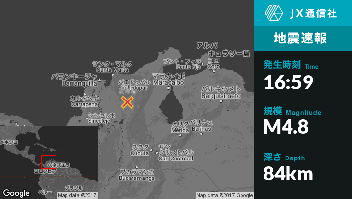| 震源地 | コロンビアのAgustin Codazziから西北西38kmの地点 |
