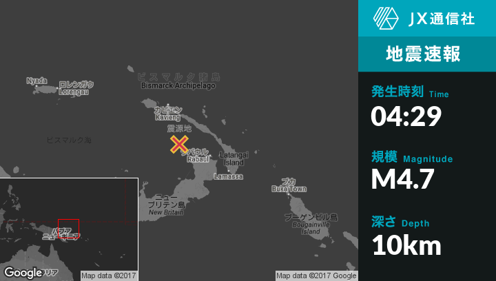 10月27日 04:29頃、パプアニューギニアのRabaulから西北西123kmの地点でM4.7の地震がありました。