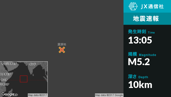 10月29日 13:05頃、モルディブのKudahuvadhooから西690kmの地点でM5.2の地震がありました。