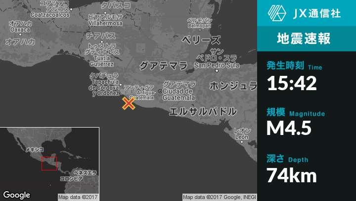 10月30日 15:42頃、グアテマラのChampericoから南8kmの地点でM4.5の地震がありました。
