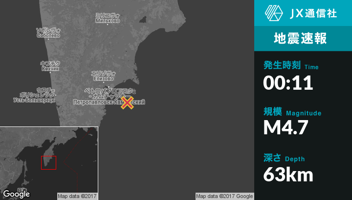 | 震源地 | ロシアのPetropavlovsk-Kamchatskiyから南東70kmの地点 |
