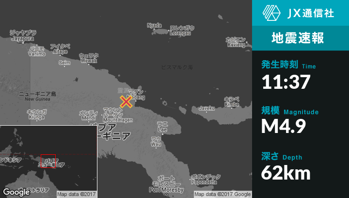 12月03日 11:37頃、パプアニューギニアのMadangから西北西50kmの地点でM4.9の地震がありました。