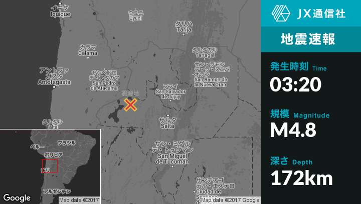| 震源地 | アルゼンチンのSan Antonio de los Cobresから西75kmの地点 |