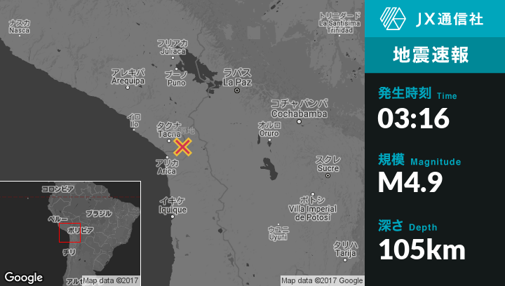 12月21日 03:16頃、チリのPutreから西北西32kmの地点でM4.9の地震がありました。