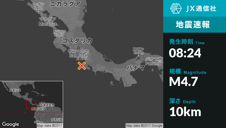 | 震源地 | コスタリカのCiudad Cortesから西南西41kmの地点 |